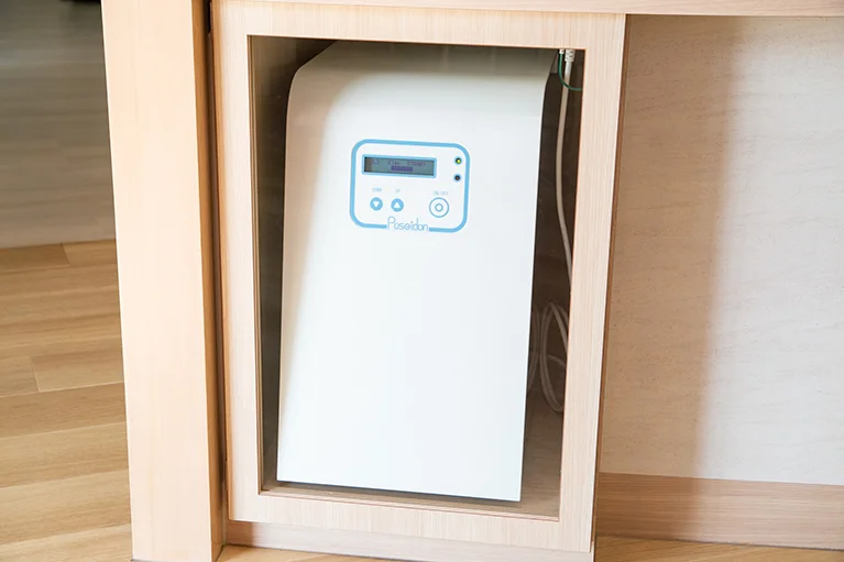 当院では、患者様がうがいをする水から、ユニットや器具の洗浄、治療に使用する水に至るまで、院内を循環するすべての水を衛生的に保つための除菌システムを導入しています。